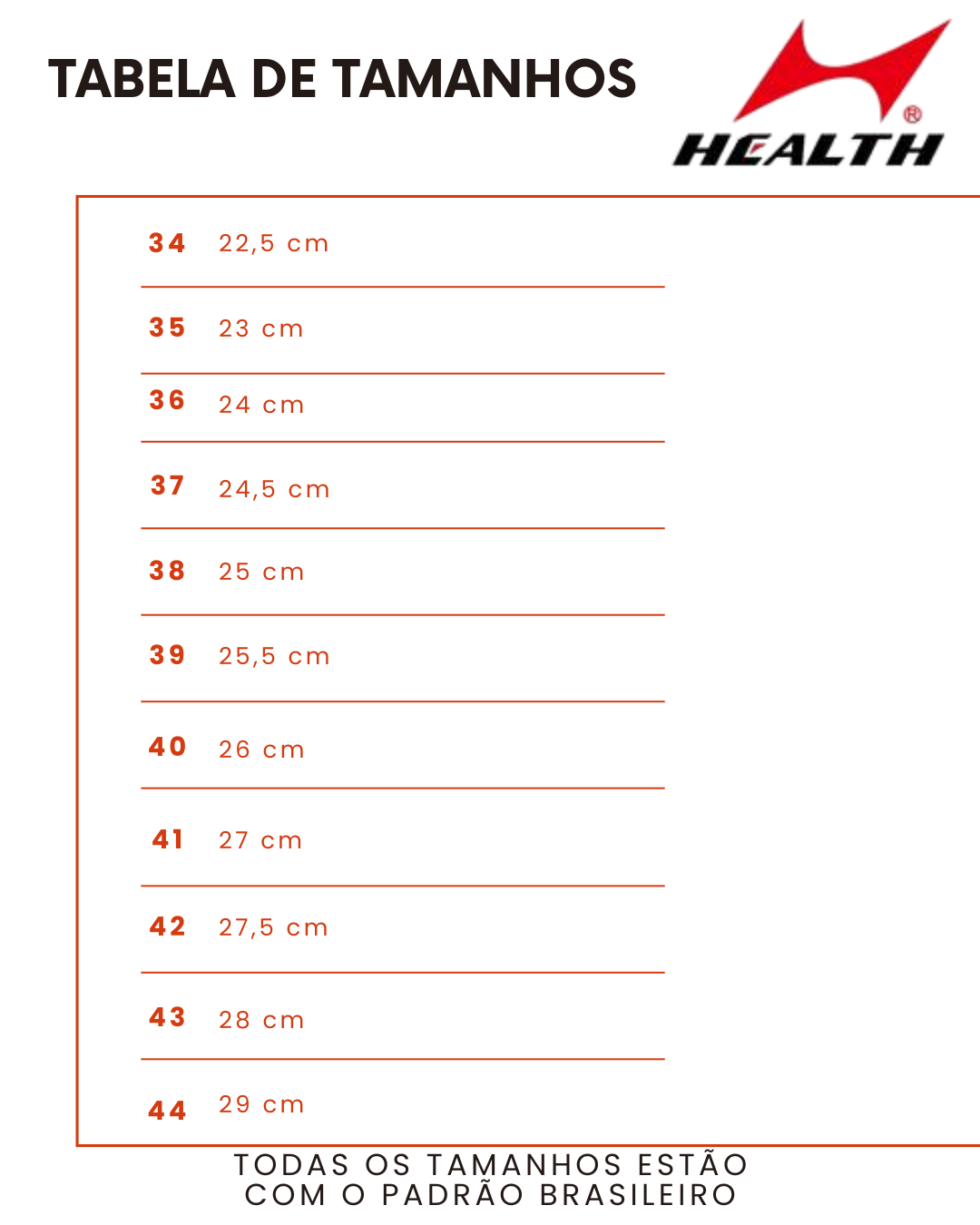 O solado é antiderrapante, com altíssima durabilidade, mantendo a qualidade já reconhecida da Health. Garante excelente tração em diferentes tipos de piso, oferecendo confiança tanto em treinos diários quanto em usos prolongados.